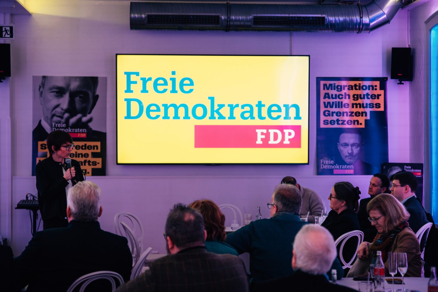 „Wir müssen den Menschen Sicherheit zurückgeben“, ging sie auf den Messerangriff in Aschaffenburg ein. Für Skudelny steht fest, wer zu uns kommt, muss nachweisen können, wer er ist, um sicherzustellen, dass keine Menschen mit krimineller Vergangenheit ins Land kommen. Und schließlich verlangt sie auch als Mutter einer Teenager Tochter, dass Party Gäste vorgestellt werden. Als Insolvenzverwalterin beobachtet Skudelny schon seit einiger Zeit Wohlstandsverluste, besonders der Mittelschicht. Die soziale Sicherheit nimmt ab. Deshalb benötigen wir dringend eine Wirtschaftswende. Mit Humor verdeutlichte sie den Bürokratieabbau am Beispiel überflüssiger Pflichtschulungen. So muss ihr Tierarzt für seine angestellten Ärzte jedes Jahr eine Sicherheitsschulung anbieten, bei der erfahrene Tierärzte erfahren: „das Pferd hat vorne Zähne und kann beißen und hinten Hufe und kann treten“. „Wir brauchen einen Politikwechsel, keinen neuen Kanzler“, betont Skudelny und beendet den Vortrag mit dem Wahlslogan der Liberalen „Alles lässt sich ändern“.